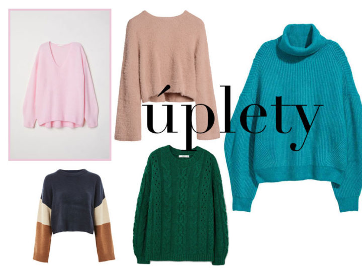 Růžový a modrý svetr, H&M (patro –1 a 0). Béžový svetr, RESERVED (patro 0). Zelený svetr, MANGO (patro +1). Svetr s barevnými bloky, TOPSHOP (patro +1).