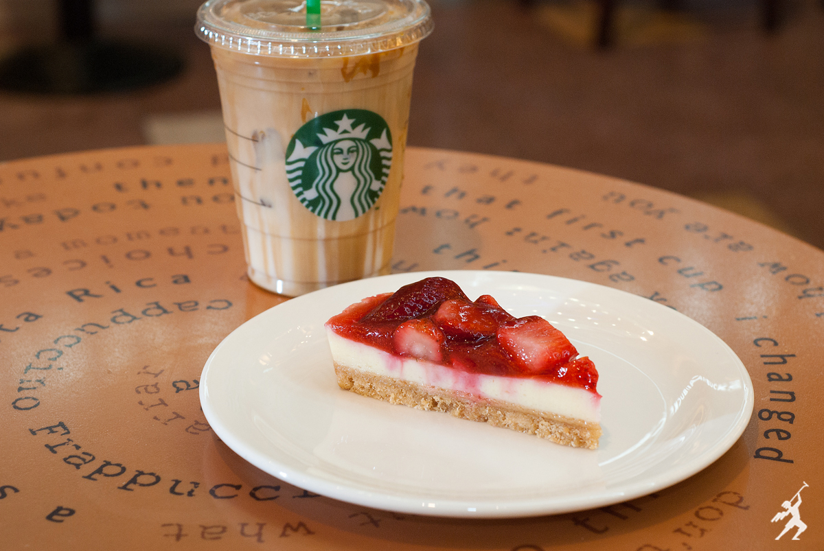 My jsme si nakonec vybrali vizuálně i chuťově skvělé Iced Latté s javorovým sirupem, cappuccino a znamenitý jahodový cheesecake.