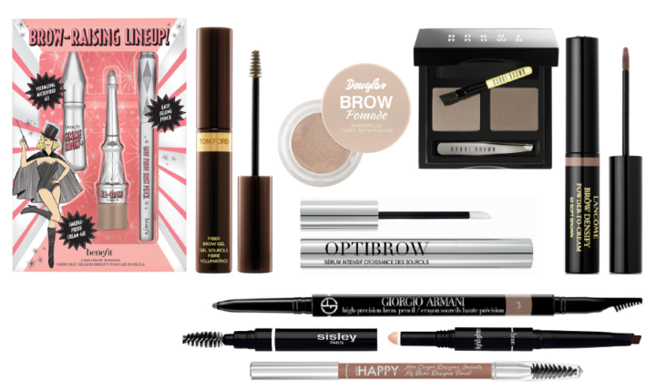 Sada mini produktů na úpravu obočí Brow-Raising Lineup!, SEPHORA (patro 0). Gel na obočí Fiber Brow Gel Tom Ford, gel na obočí Brow Pomade Douglas a set na obočí Brow Kit Bobbi Brown, DOUGLAS (patro –1). Pudr na obočí Lancôme Brôw Densify Powder to Cream a sérum na posílení růstu obočí Apot Care Optibrow Advanced, Marionnaud Perfumeries (patro –2). Tužka na obočí High Precision Brow Pencil Giorgio Armani Beauty, DOUGLAS (patro –1). Tužka na obočí 3 v 1 Sisley Phyto-Sourcils Design (barva, péče, přesnost) a tužka na obočí Marionnaud Make Me Happy, Marionnaud Perfumeries (patro –2).