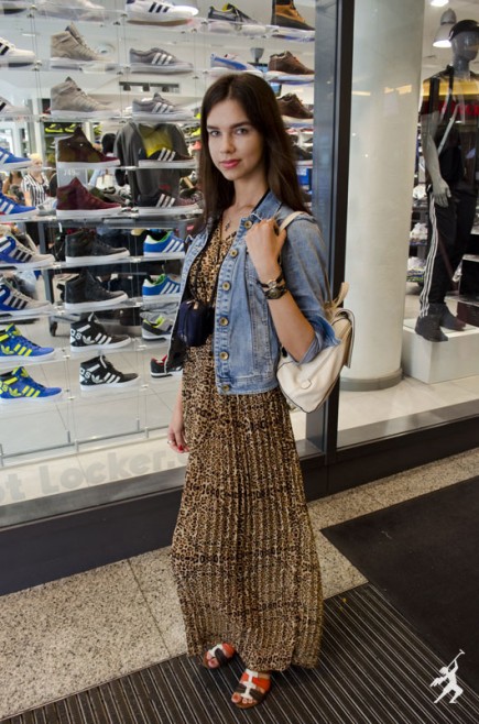 Hned u vchodu do centra jsme narazili na velmi vysokou slečnu v rozevlátých leopardích plisovaných šatech. Kromě krásně upraveného obočí nás zaujala i pohodovou kombinací vzdušných maxi a džínsky. Pro období babího léta je to zaručeně top 1.