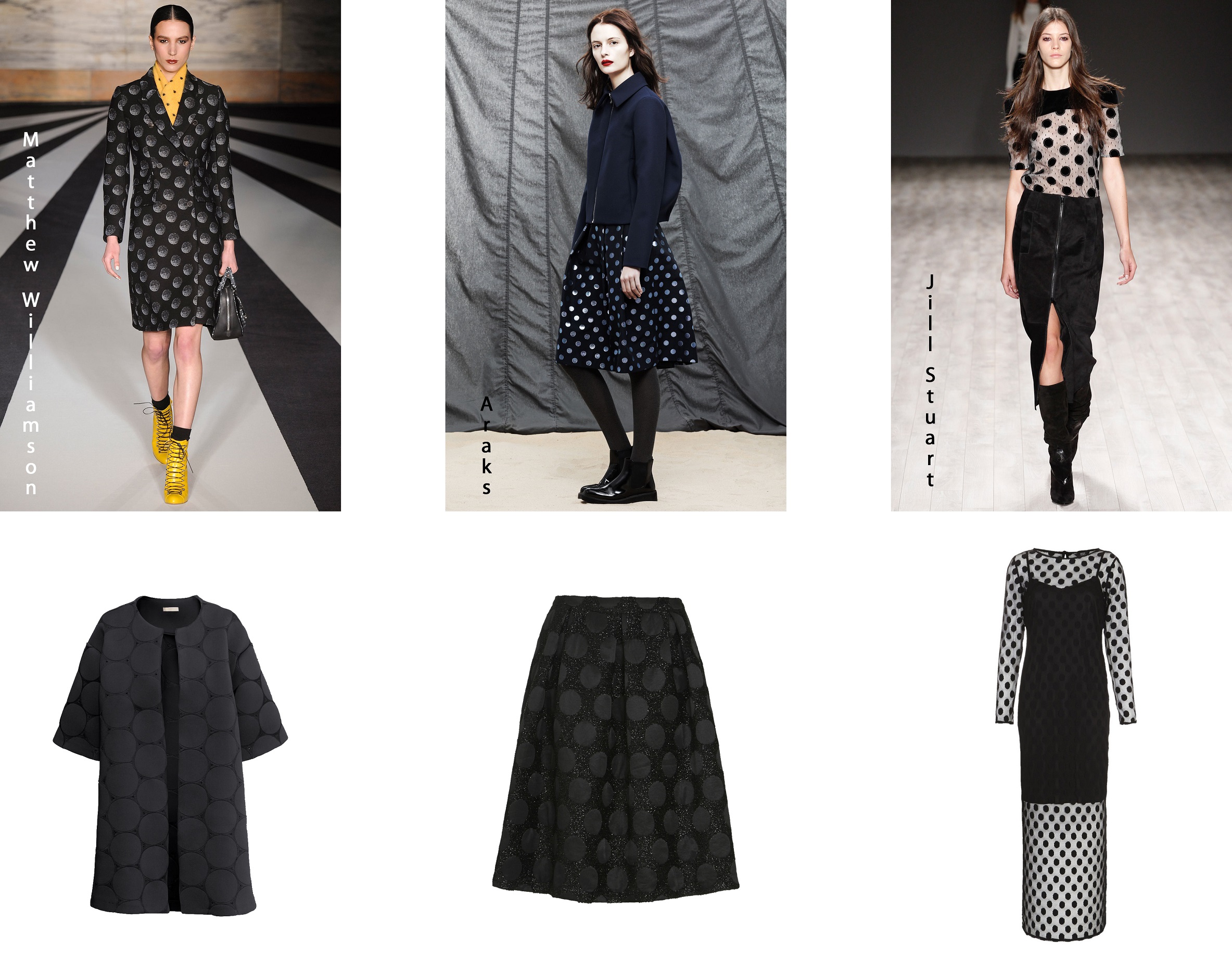 Pro letošní podzim/zimu 2014 návrháři nešetřili s barvami ani použitými materiály. Puntíky sice nejsou primárním vzorem modelů, ale spolu s dalšími potisky či textiliemi tvoří originální kousky. Velice nestandartním a výstředním přístupem pojala „dots trend“ italská módní značka Moschino, která mě nepřestává bavit. Její kolekce jsou hravé a neotřelé. Žlutým puntíkovaným modelem se trefila do vkusu snad každé naivní a rozverné ženě, která fandí animované postavičce Spongebob. Pokud máte raději decentnější klasiku, zaměřte se na doplňky. Punčocháče s vícebarevným jemným puntíkem oživí i na první pohled jednoduchý outfit. Buďte vidět!