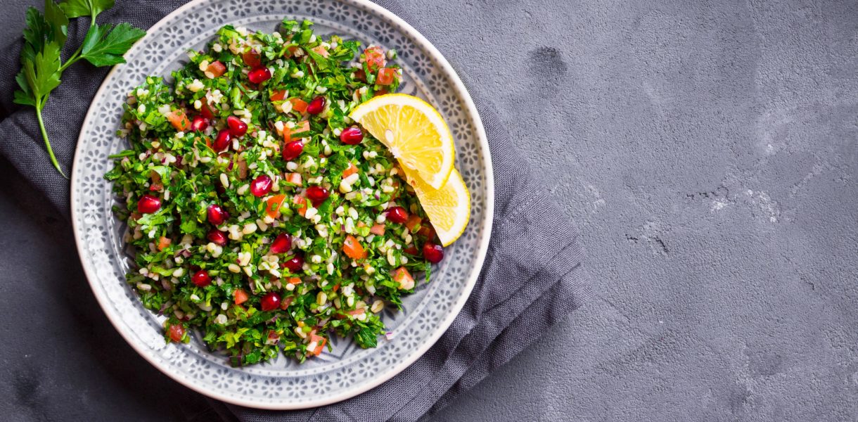 Petržel nakrájíme na malé kousky, opláchneme vodou a necháme okapat. Namočíme bulgur, aby změknul. Pak nakrájíme rajčata na malé kousky a cibuli na jemno. Všechny ingredience smícháme a dochutíme solí, čerstvě vymačkanou citronovou šťávou a olivovým olejem. Servírujeme na listech římského salátu a ozdobíme větvičkou máty.