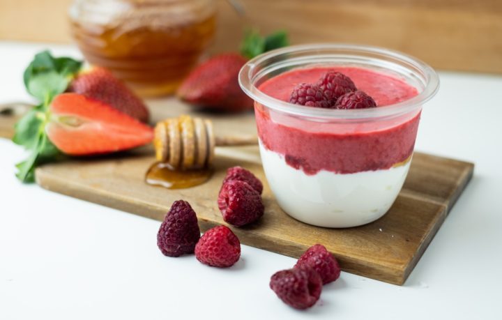 Do čtyř sklenic rozdělíme tvaroh a zakapeme jej medem. Rozmixujeme jahody, maliny a kokosové mléko. Pyré nalijeme na med a ozdobíme malinami.